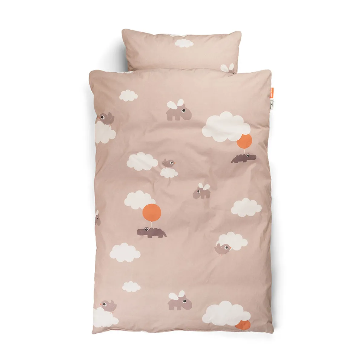 Sengesættet har en blød pudderfarve og et sødt print med Birdee, Ozzo og Croco og drømmende elementer som skyer og balloner.