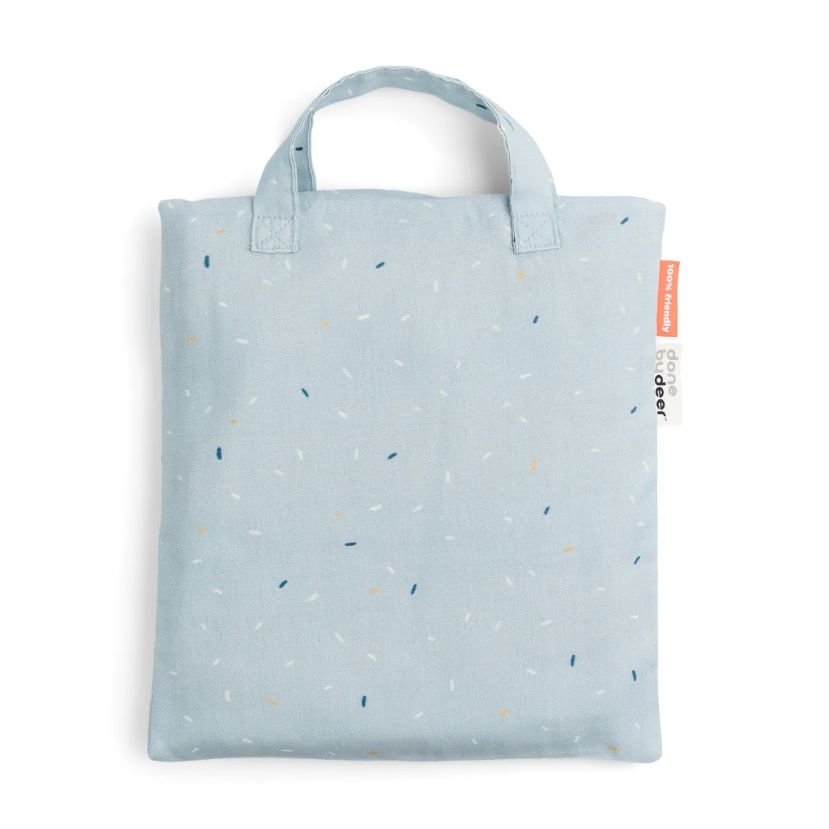 – Pakket i en lille tote bag i bomuld, der matcher sengesættet, og som kan bruges til legetøj, skiftetøj, sko eller andre praktiske formål