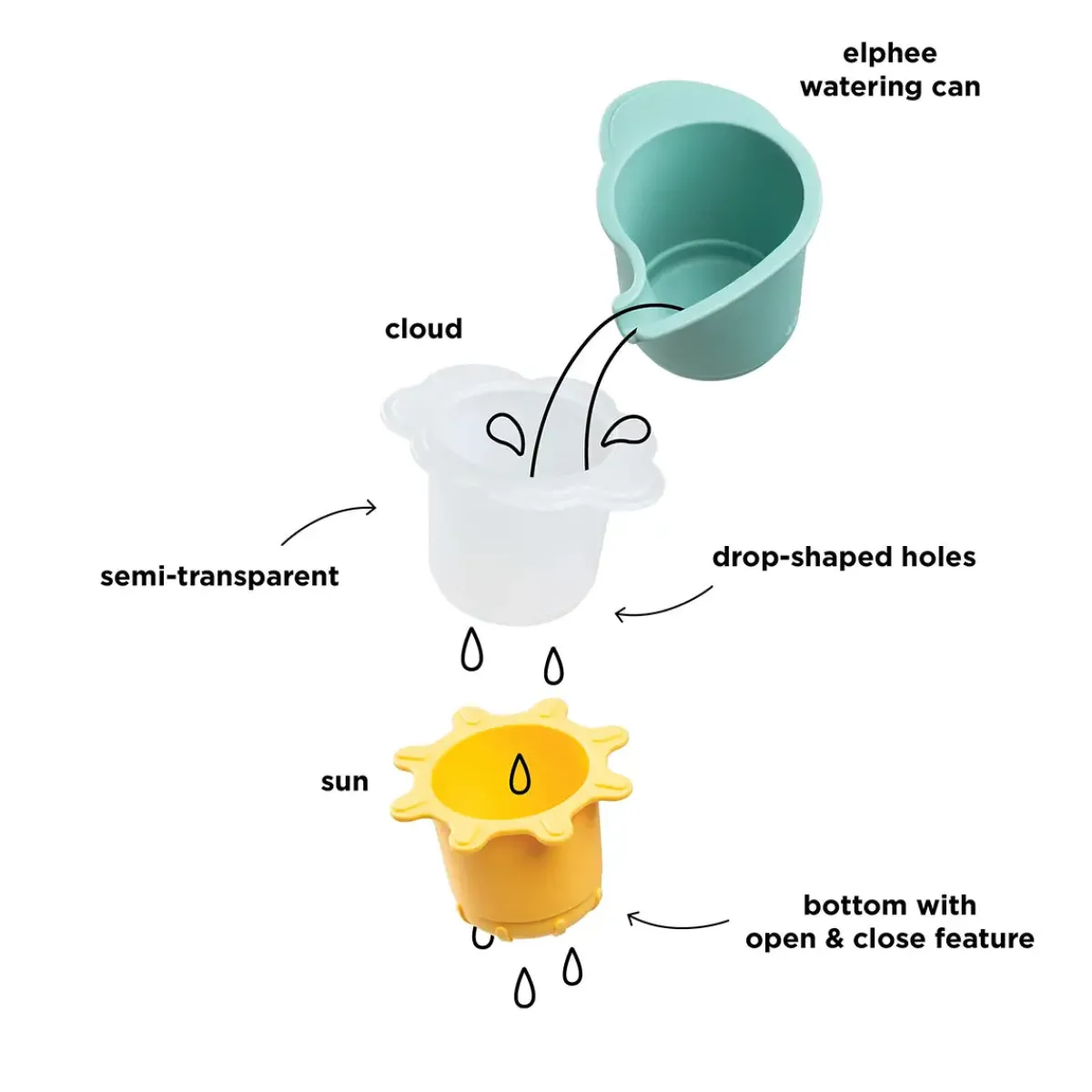 The set includes an Elphee-shaped cup, a cloud-shaped cup with holes in the bottom, and a sun-shaped cup that opens and closes, allowing your child to enjoy interactive water play. The soft powder-colored hues and cute shapes add to the visual appeal while encouraging imaginative play.