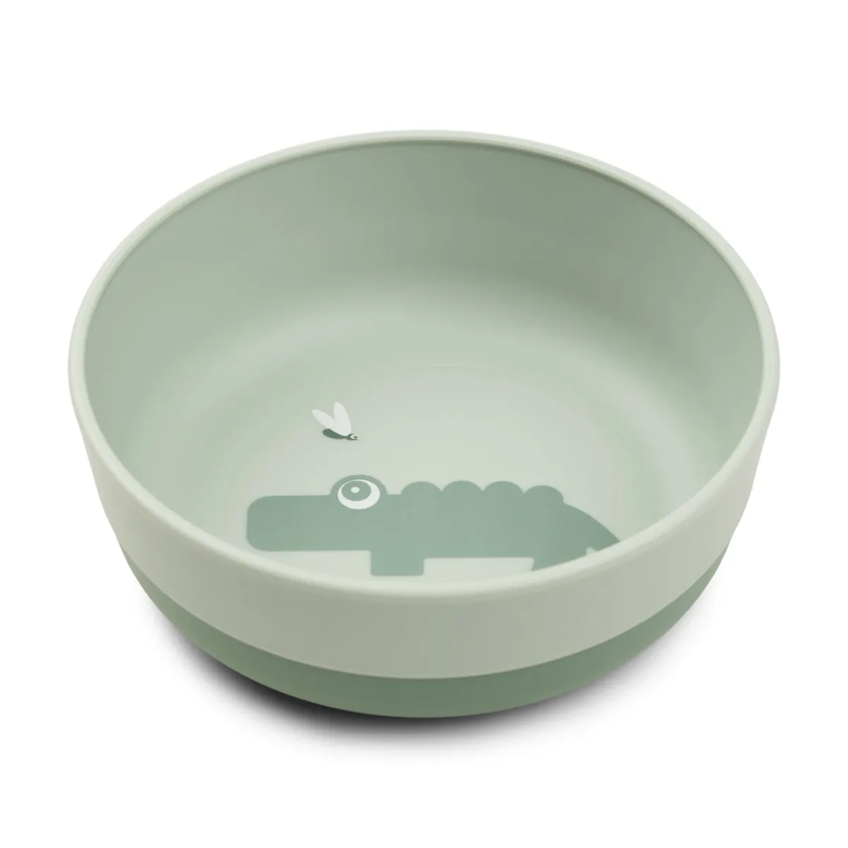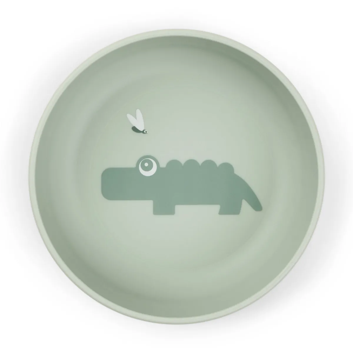 Foodie-skålen i grøn er trykt med et cool motiv af den hjertevarme krokodille Croco, der kigger på et par ildfluer. Dens silkematte overflade matcher resten af Foodie-kollektionen. Basens mørkere grønne farve giver en fin tofarvet detalje.