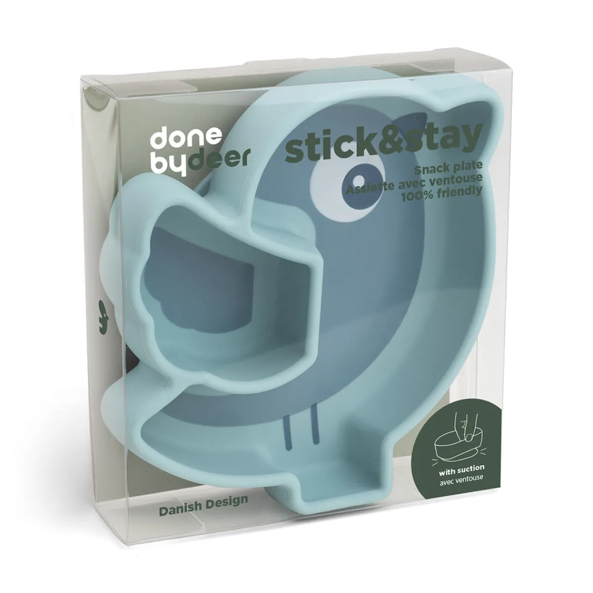 Oplev funktionalitet og stil med vores Birdee Stick&Stay snack tallerken i en dejlig blå farve. Den er fremstillet af 100 % fødevaregodkendt, BPA-fri silikone og er sikker at bruge for børn. Sugebasen forhindrer spild ved at modstå børns forsøg på at skubbe, tippe eller kaste tallerkenen. En klap, der er nem at løsne, er skjult under Birdees vinge.