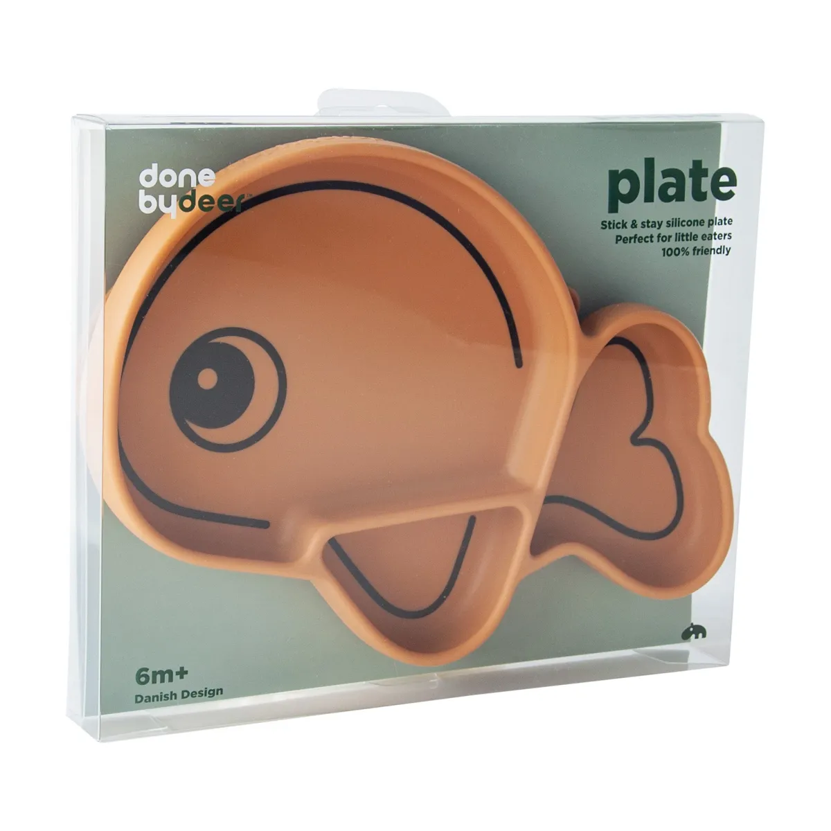 Sugekoppen holder tallerkenen på plads og hjælper små spisere med at øve deres spisefærdigheder. Tryk tallerkenen ned, og den klæber til de fleste glatte overflader og forhindrer børn i at vælte eller kaste den. En klap, der er nem at løsne, er skjult under halen.
