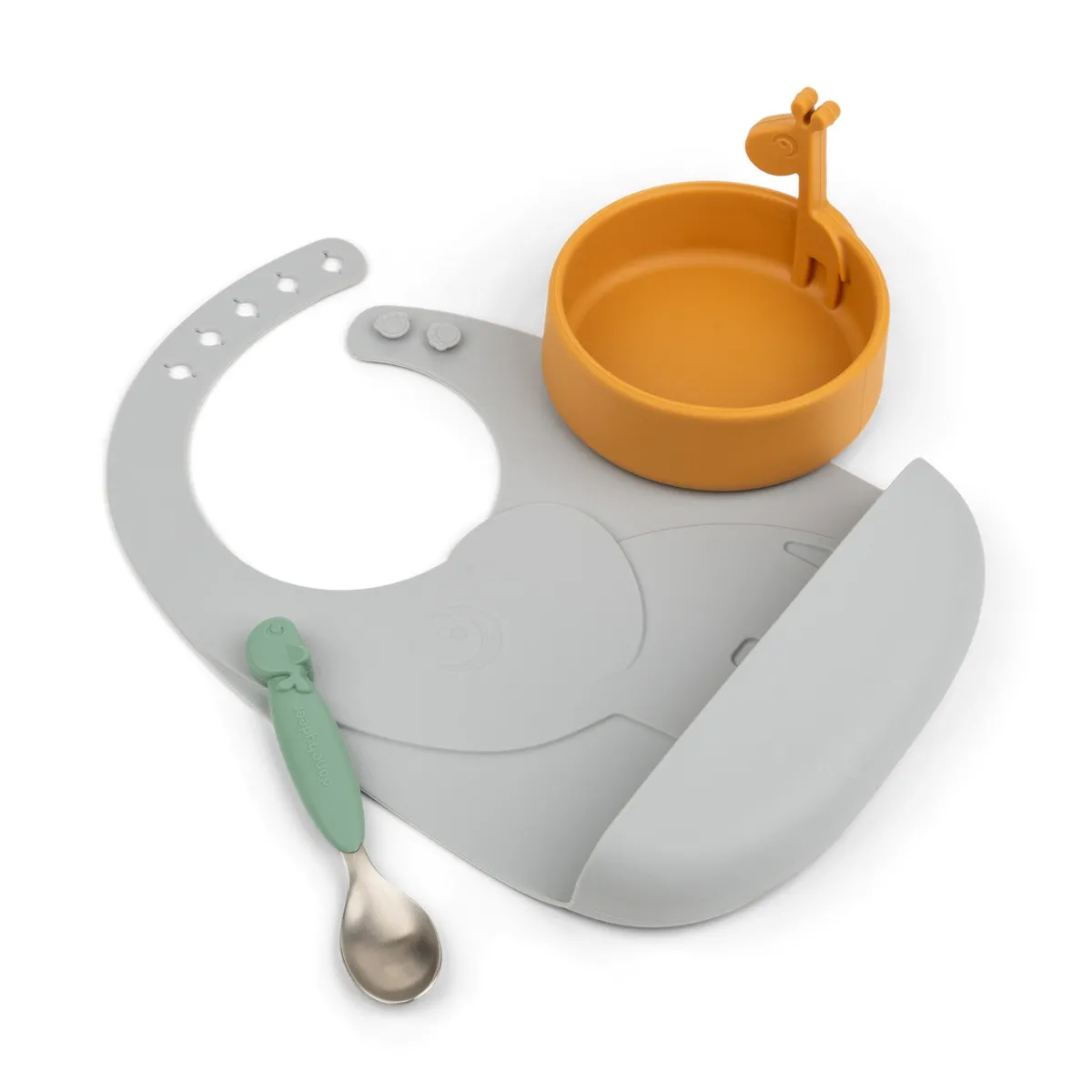 Børnene vil nyde at have dyrene med til måltiderne – lad Elphees lomme fange den mad, der glipper, og lad Raffi opmuntre dem til at nå den spændende milepæl, det er at spise selv. Det søde gavesæt er i en blanding af grå, grøn og sennep.