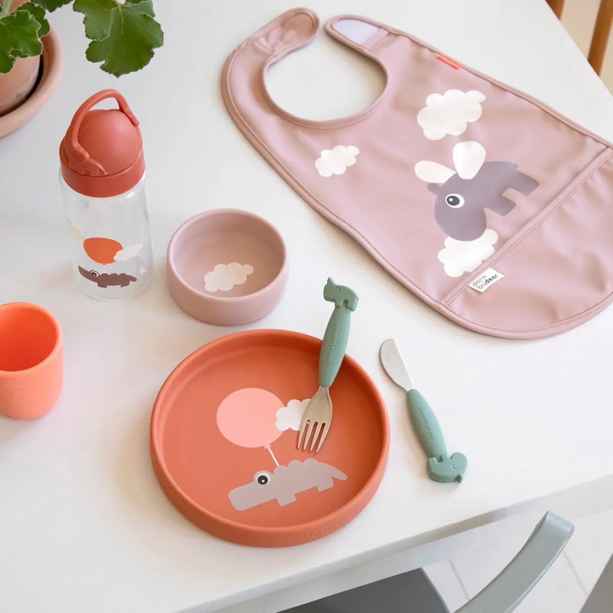 En papaya-farvet Croco-tallerken, en puddersky-skål og et frisk koral-minikrus gør dette børnemåltidssæt til en perfekt gaveidé til småspisere.