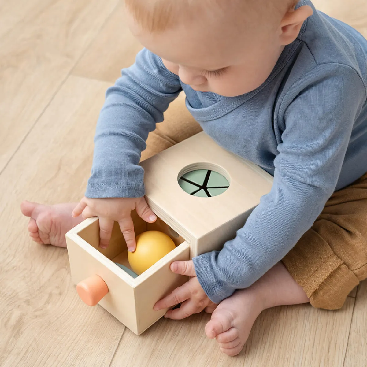 Lad dit barn se og lære, når ting forsvinder, hvilket øger glæden ved at opdage og styrker forståelsen. Boldens ranglende lyd giver auditiv stimulering, og når du vender æsken, får du en mere udfordrende hulform. For ekstra sjov kan du bruge et legetørklæde eller en klud til at trække tingene ud. Fremstillet af ansvarligt indkøbt træ og malet med sikker, vandbaseret maling, hvilket sikrer en sikker og sjov legeoplevelse for dit barn.