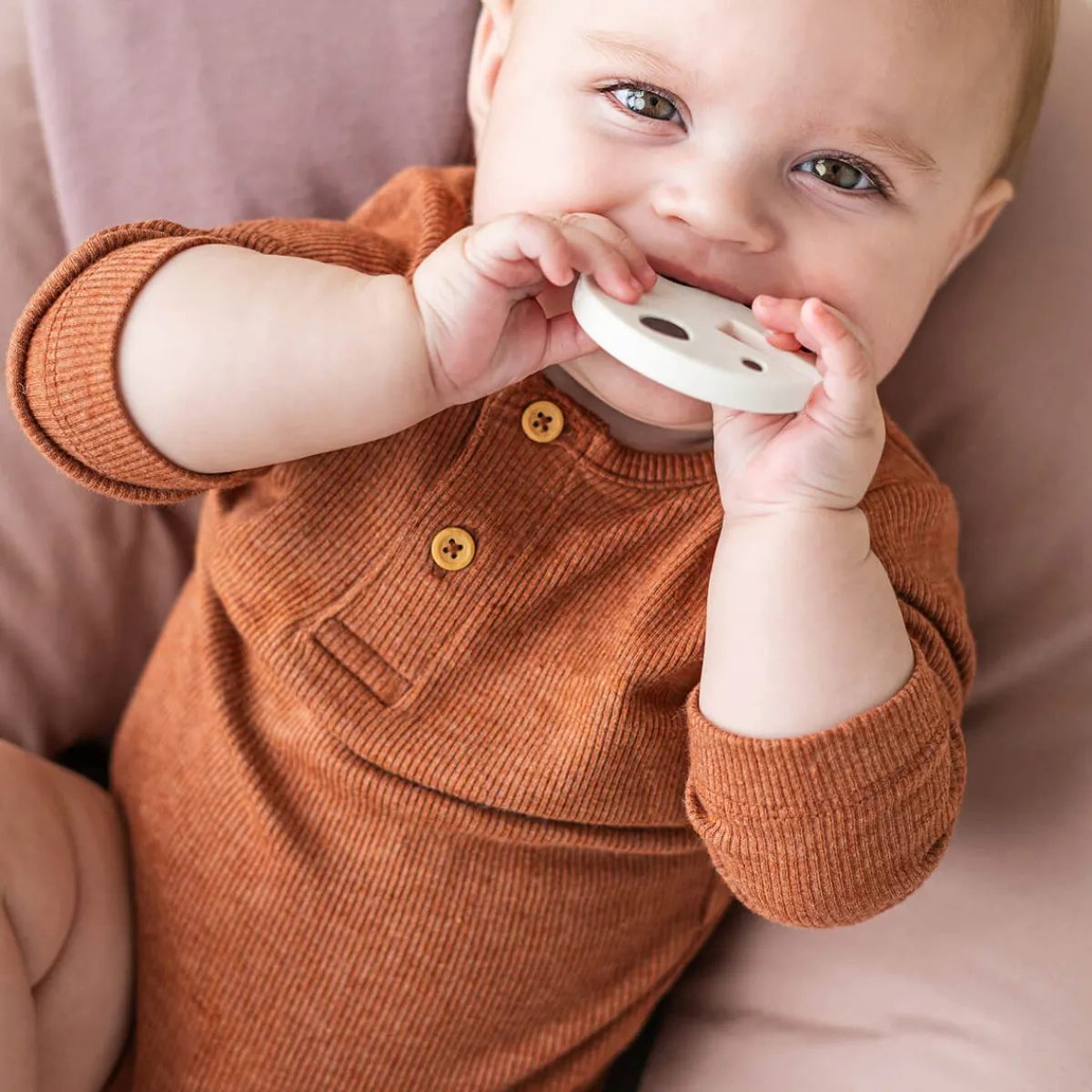Den yndige Ozzo-figur er lavet af ansvarligt indkøbt træ, og silikonedelen er lavet af babysikker silikone med stimulerende kontrastfarve. En sød lille hale af snor giver et farverigt twist. Silikonedelen kan bruges som bidering, der lindrer ømme gummer. Lad dit barn træne og lære nye færdigheder med den glade flodhest Ozzo.