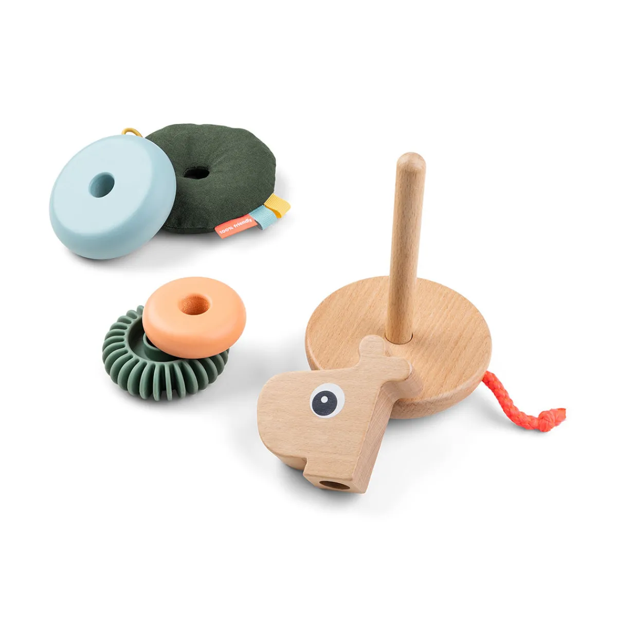 Ringene er lavet i forskellige størrelser – nogle af dem med små mærker, tekstil og riller. Stableren har også en vippefunktion og en kort hale, der kan trækkes i – begge dele er designet til at stimulere dit barns sanser gennem leg.