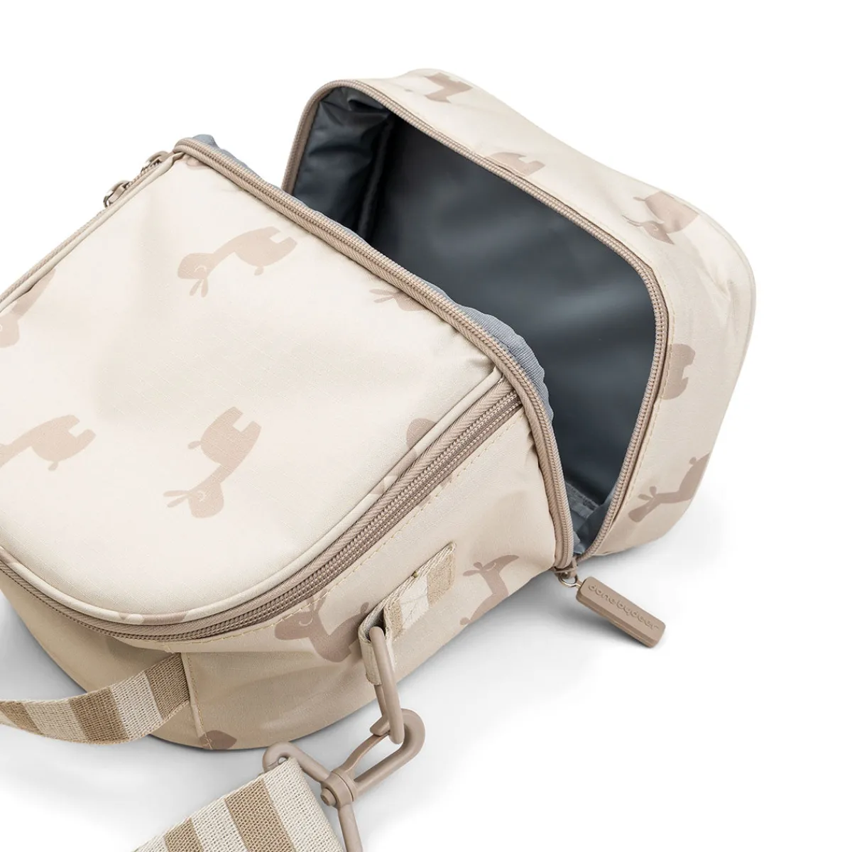 Den isolerede taske er designet i en flot sandfarve med et all-over print af Lalee, lamaen. Håndtag og skulderrem har Done by Deers signaturstriber i sand. Det slidstærke og vejrbestandige stof er nemt at rengøre med en fugtig klud.